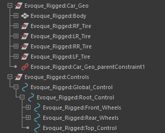 Next, my sights were set on getting the car rigged. This was something I have never touched before, but a few tutorials later I was a rigging pro, at least for cars. The car rig is nothing special. A NURBS curve acts as the controls for the objects I defined by groups. There are controls for the individual front tires, then the set of them, the rear tires, and the set. The top control allows the animator to control the body roll, and the control around the middle of the body, the root control, allows the animator to move the car front or back and the wheels will roll with the car the correct amount. Then just a world control at the bottom so it can be easily placed in the scene.