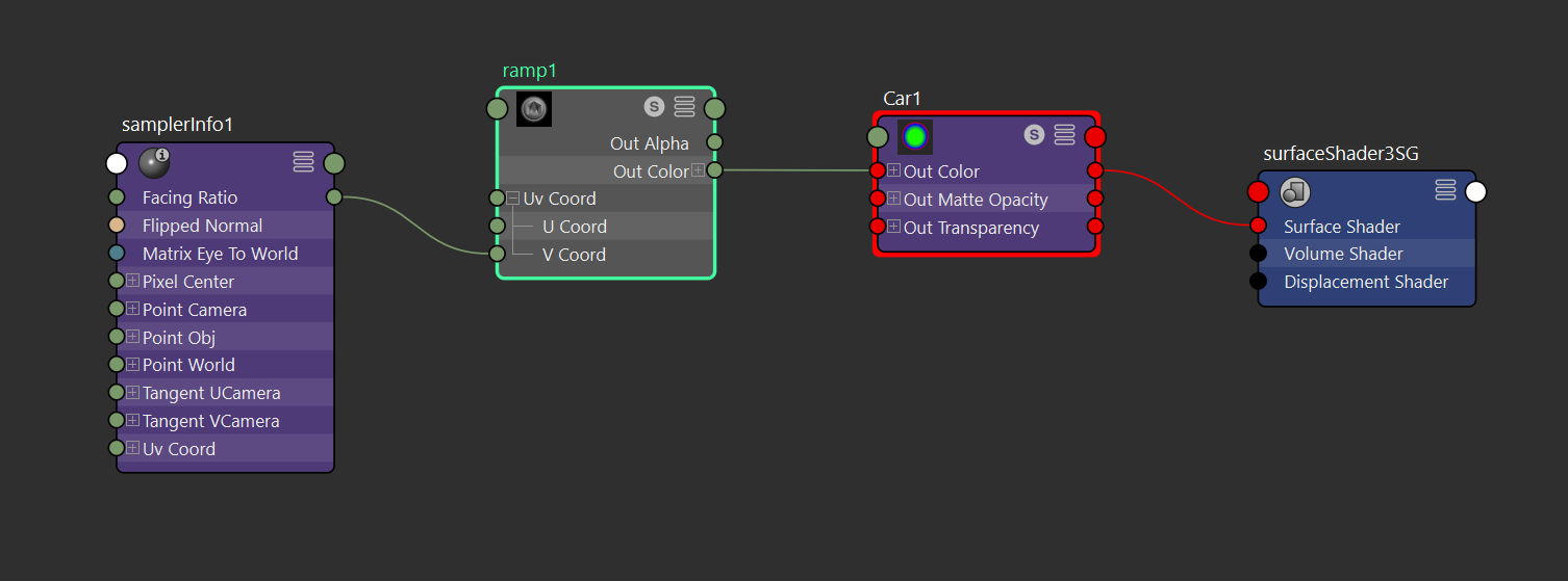 This was done by placing a Maya Surface Shader on the car and plugging a ramp into the Color Out. Plugging the Facing Ratio from the “SamplerInfo” node into the V coordinates of the Ramp gives this effect on the car. Allowing the compositors job a little easier.